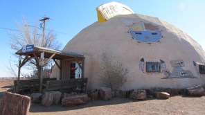 This one happened to be shaped like a huge…igloo? Wikiup? I am not sure what type of Native American dwelling they might have been going for, and the hodge-podge of symbols decorating the exterior — standard eagle feathers framed a window directly below a Zuni sun symbol (next to a rendering of petrified wood) — didn’t help the identification process. On a side note, if this huge structure happens to escape your attention as you whiz by, don’t worry; there’s no way you’ll miss the biggest dreamcatcher you’ve ever laid eyes on, erected right out front!